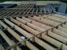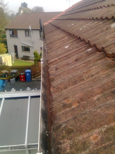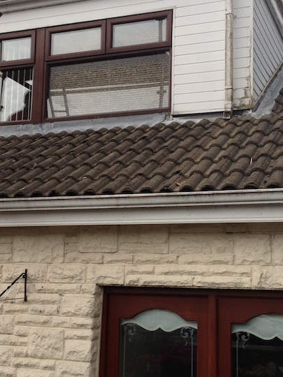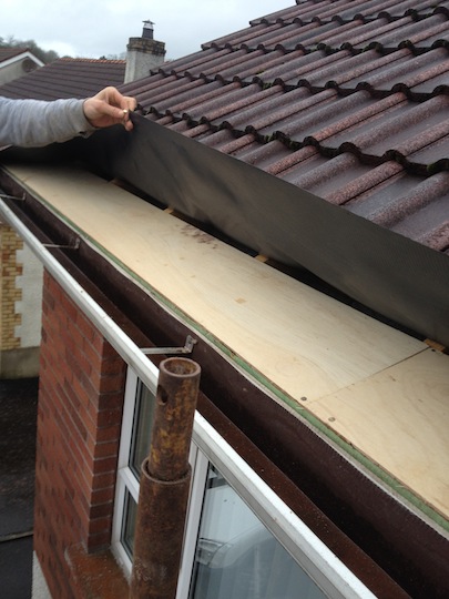 Over a period of time a valley that had been leaking on this roof rotted away the soffit. The roofing felt along the bottom row of tiles was replaced (having also rotted away) and 6mm plywood set on so that new membrane won't sag and rot. New UPVC soffit fitted and made good.